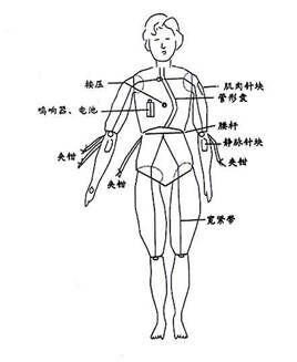2、全身所有注射、穿刺部位的針均用軟塑制,小針塊后裝一塑料瓶,該瓶可容20CC液體作為抽液之用。