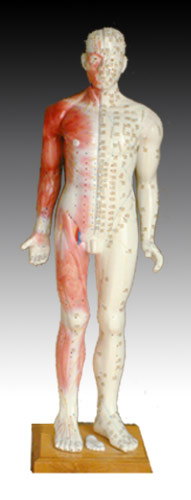 這款彩色的塑料模型非常詳細地標明了14條主要經(jīng)絡(luò)線,身體右側(cè)是361個經(jīng)穴和48個經(jīng)外穴以及骨度線,即用“寸”來方便地測量針灸點之間的距離。身體左側(cè)是皮下組織,顯示神經(jīng)系統(tǒng)分布、動靜脈、血管和肌肉構(gòu)造,還標明了在主要經(jīng)絡(luò)線上沒有標明的手足部的經(jīng)外穴。適用于中醫(yī)教學、針灸和推拿等。用PVC制成。尺寸:84CM高。